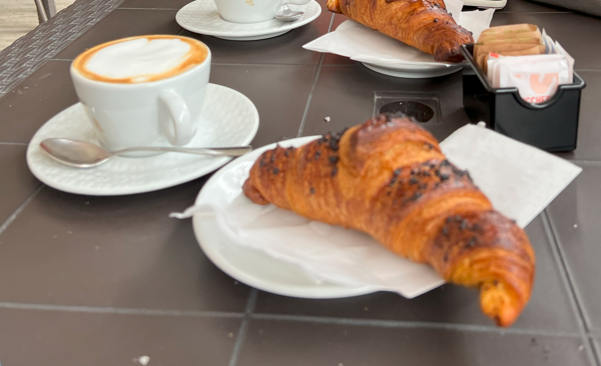 まず、朝はホテルのテラスでクロワッサンとカプチーノをいただきます。